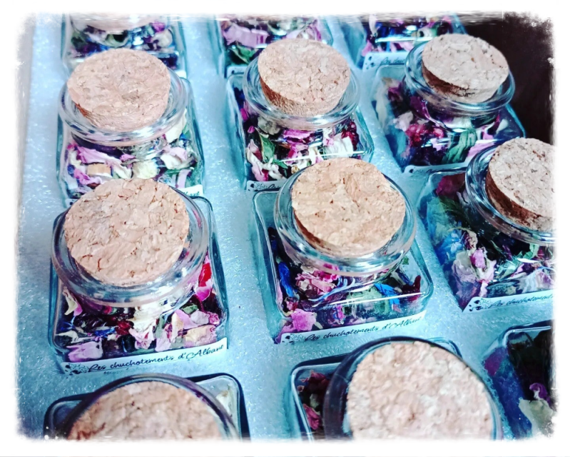 Réalisation de mélanges personnalisés pour offrir à des invités lors d'un baptême. La cliente a ramené ses propres contenants. Suivez en image la réalisation de ce projet!